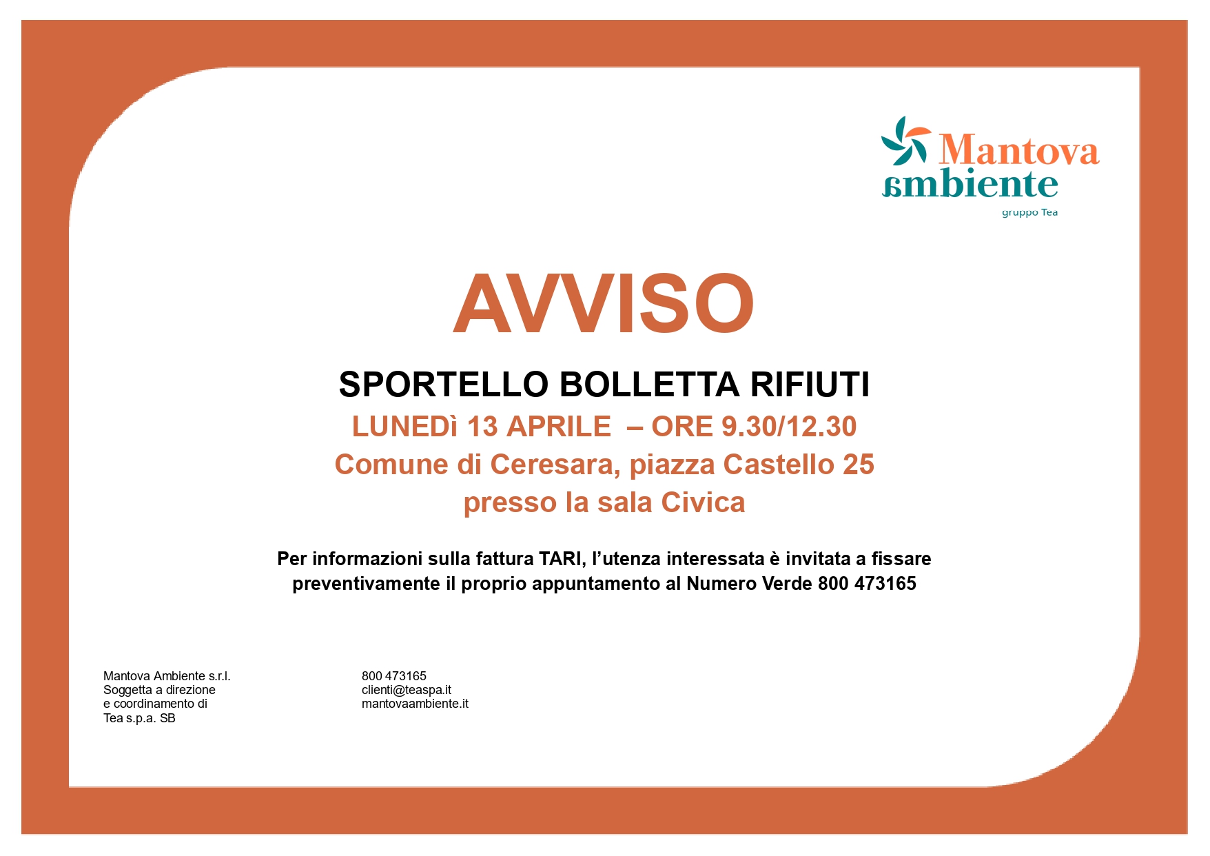 Lunedi 13 aprile dalle ore 9.30 alle ore 12.30, presso la sala civica di Ceresara saranno presenti gli incaricati di Mantova Ambiente Per informazioni sulla fattura TARI, l’utenza interessata è invitata a fissare preventivamente il proprio appuntamento al Numero Verde 800 473165